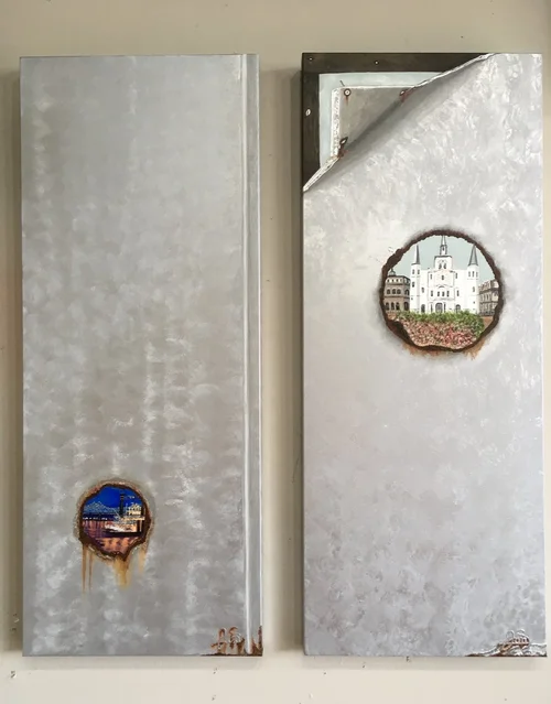 Each 16 X 40 canvas with “metallic” background (painted), and second work with tromp l’oeil image of bent metal.