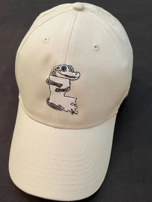 Our Love-LA image embroidered on a neutral, light tan baseball cap. Velcro strap on back adjusts for head size and/or “ponytail” thickness.
