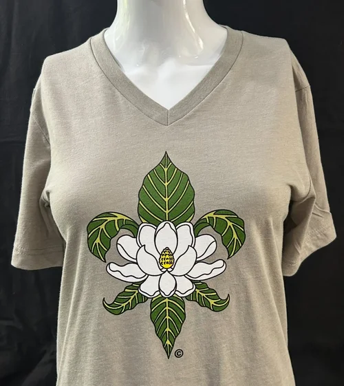 Super-soft Bella stock tee with our copyrighted Magolia image, the state flower of both Louisiana and Mississippi.